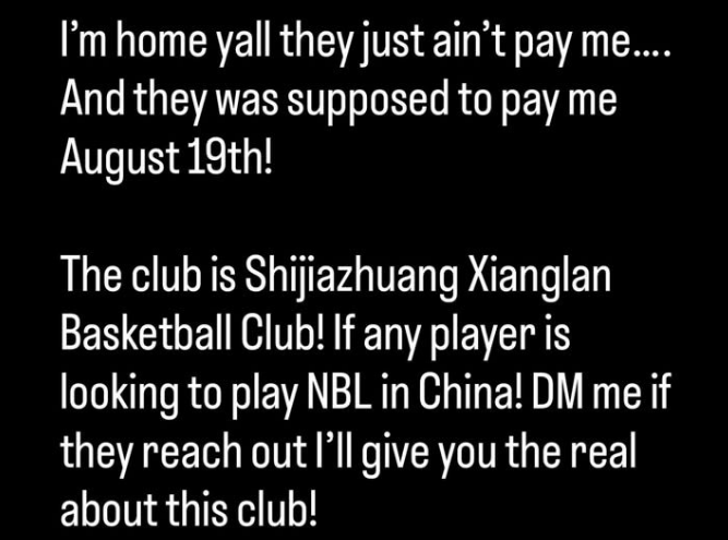 帕斯卡尔在社媒上如今讨薪表示:“我已经回家,但他们依然没有给我剩余薪水,他们本该在8月19日付给我薪水,这家俱乐部就是石家庄翔兰俱乐部。如果有任何球员考虑去中国NBL联赛打球,如果他们联系你,请你私信我——我会告诉你关于这家俱乐部的真实情况。”