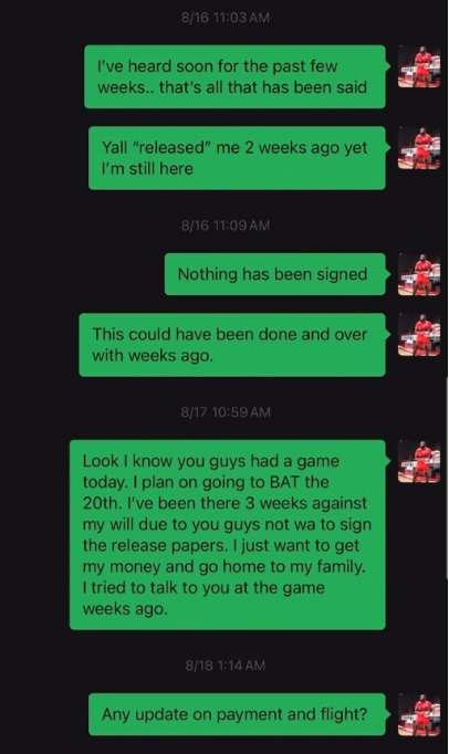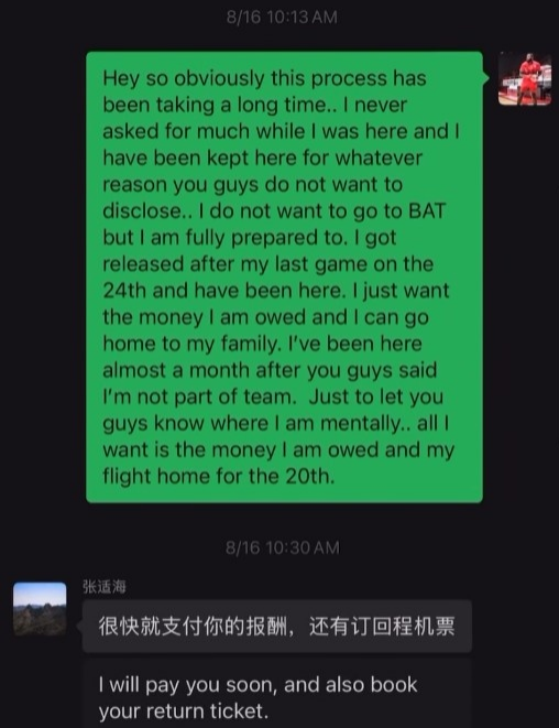 北京时间9月6日,勇士旧将帕斯卡尔在被NBL石家庄翔蓝裁掉3周之后,依然没有收到剩余的薪水,他如今通过社媒讨薪,并且晒出此前与石家庄翔蓝总经理张适海的聊天记录。
